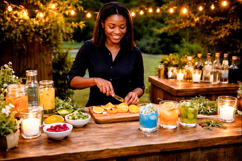 A simple garnish station adds personality and engagement. Fresh herbs, citrus wheels, dehydrated fruit, or specialty sugars allow guests to personalize their drinks while keeping the setup visually appealing.